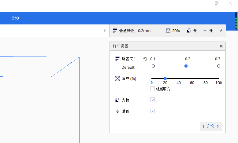 可對壁、頂?shù)撞俊⑻畛?、支撐、起始層等進行流量設置,以達到所需的質(zhì)量效果,如略微減少支撐流量以提高易拆取性。