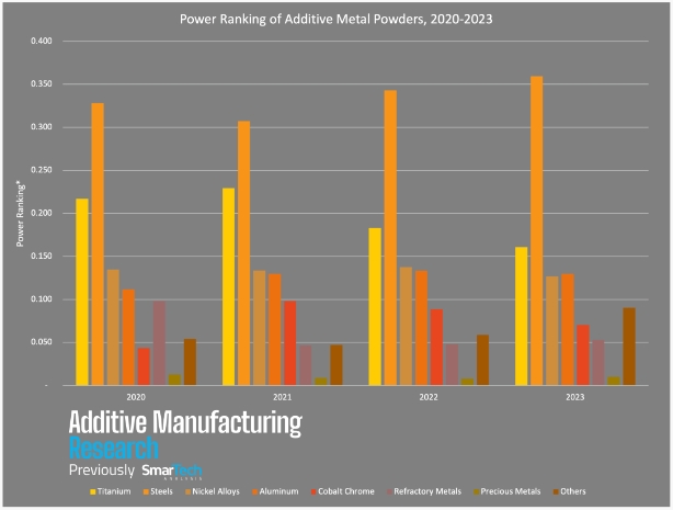 在評(píng)估金屬粉末市場(chǎng)時(shí),平衡增長和銷量等因素非常重要。為了正確比較金屬材料對(duì)整個(gè)3D打印市場(chǎng)的重要性,AMR制定了一套實(shí)力排名的方式,最終將數(shù)據(jù)標(biāo)準(zhǔn)化以進(jìn)行跨年比較。從 AMR 最新的實(shí)力排名圖表中,我們可以發(fā)現(xiàn):